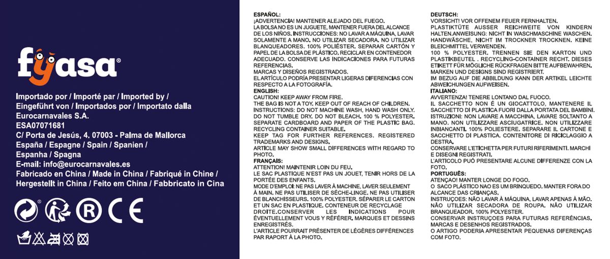 Todos nuestros Disfraces y Accesorios cumplen con las rigurosas medidas de seguridad obligatorias por la Unión Europea CE compre en CUALQUIER DISFRAZ y tenga una experiencia positiva, deje sus comentarios y/o preguntas, así ayudaran a otros clientes y crecerá nuestra comunidad, que la diversión no pare.