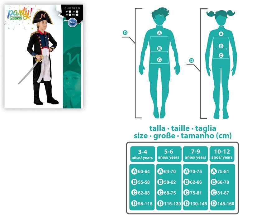 This is a fantastic Atosa costume for children. This Napoleon 5-6 costume is designed for ages 5 to 6 years. It is a perfect size for a child of 115-130 centimeters tall. The costume is made up of 5 pieces. The content is: A hat, a breastplate, a pair of pants, two shoe covers.